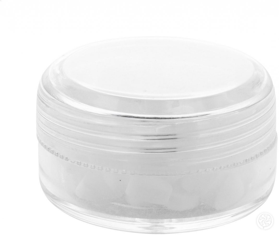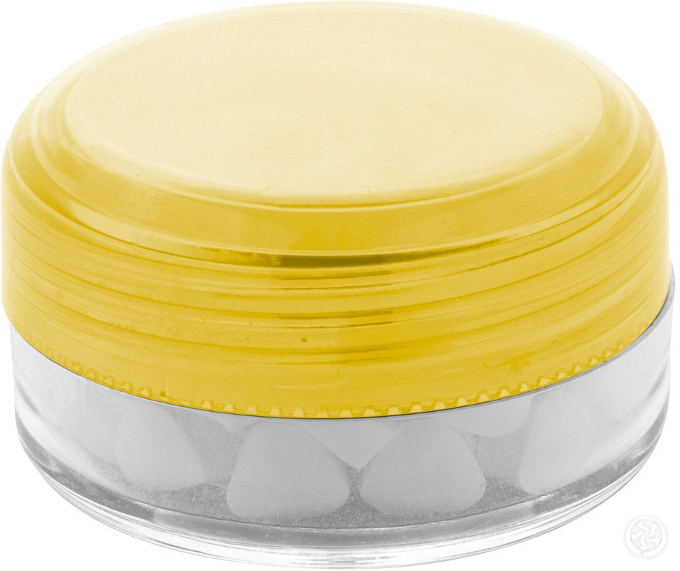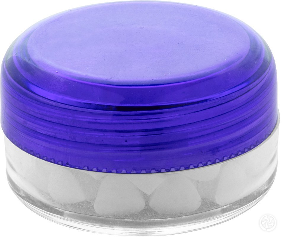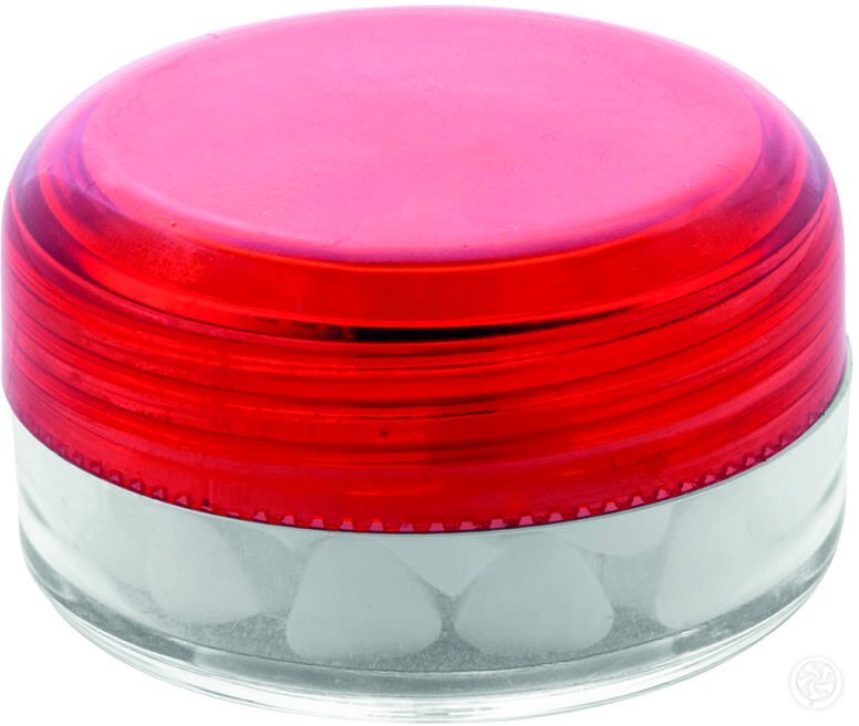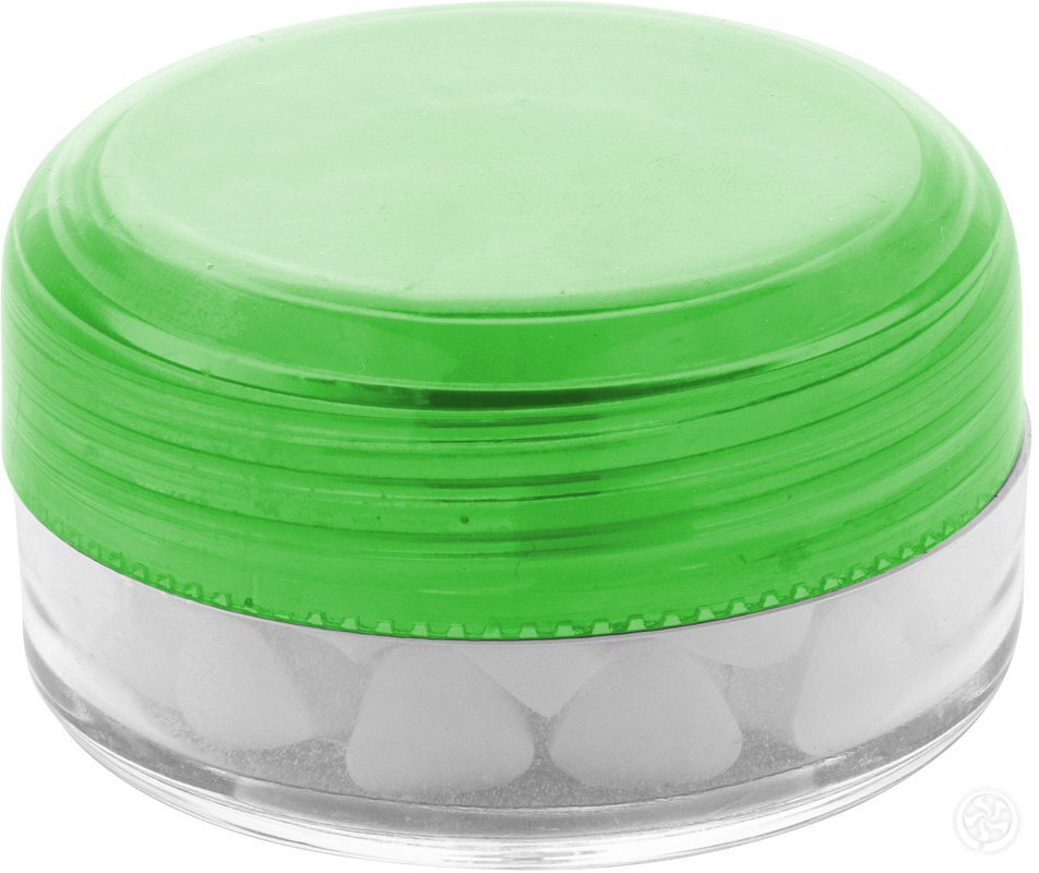 Apvalus, skaidrus plastikinis indelis su spalvotu dangteliu ir becukrėmis mėtinėmis pastilėmis