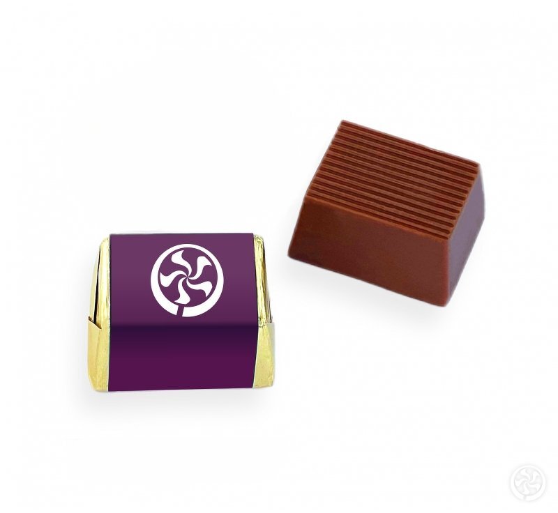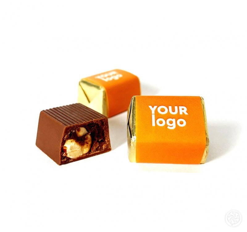 Pieniško šokolado saldainis su indivudialios spaudos etikete. Galite rinktis variantus: užpildytas lazdyno riešutais, kapučino, kavos ir kakavos kremu. su grietinėlės įdaru ir nesmulkintais lazdyno riešutais.
