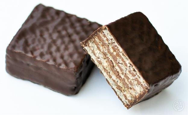 Vaflinis saldainis perteptas šokoladiniu įdaru su individualia etikete
