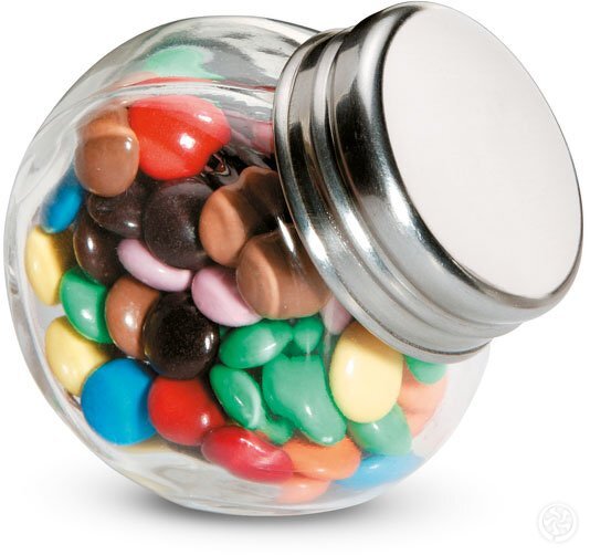 Stiklinis buteliukas su metaliniu danteliu bei saldžiais draže - galite rinktis šokoladiniai arba žele saldainiai. Kilmės šalis Nyderlandai.